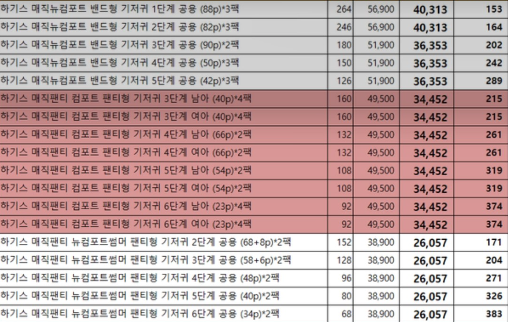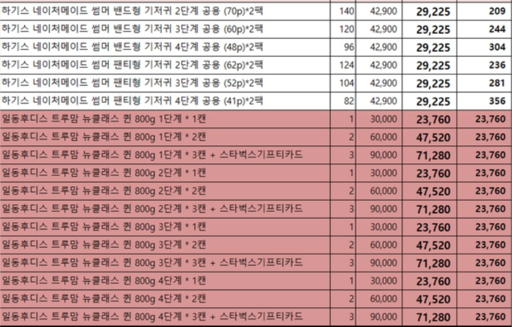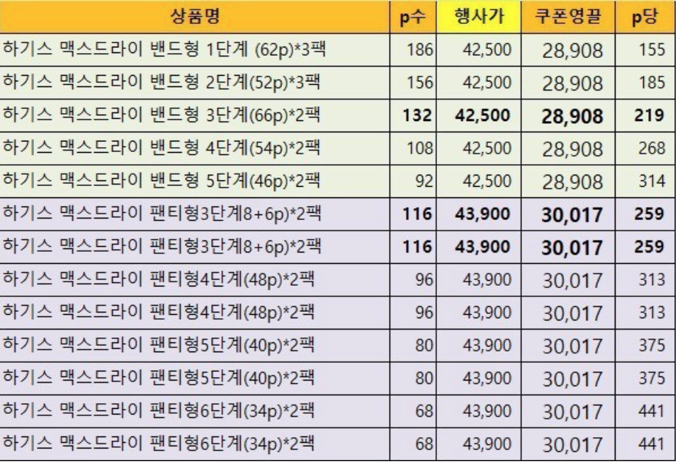 하기스 핫딜 가격표를 가져왔다.