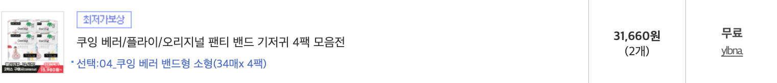 쿠잉 베러 밴드형 중형 30매 * 8팩 판매처: 티몬 원가: 47,600 원 최종가: 30,800원 (장당 128 원) [타임커머스 티몬] [맘&베이비위크] 쿠잉 베러 플라이 오리지널 밴드 팬티 기저귀 8팩/2박스 모음 국내제
