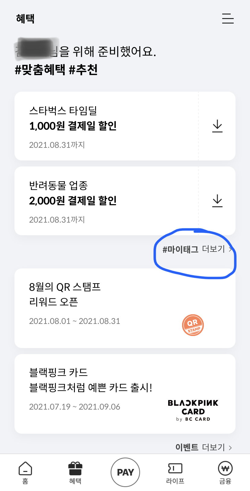 2. 하단 메뉴 [혜택] - [마이태그 더보기] 접속,