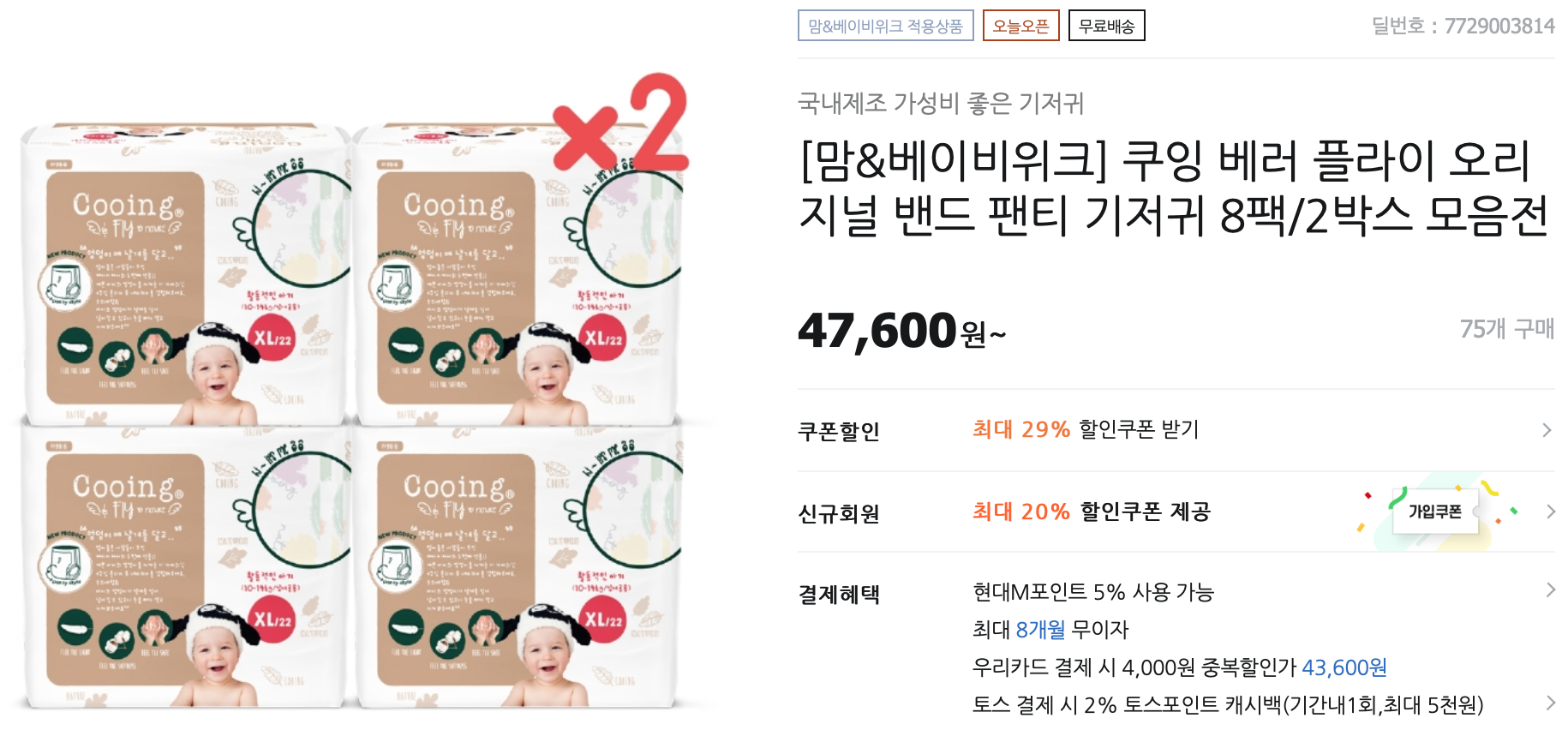 [타임커머스 티몬] [맘&베이비위크] 쿠잉 베러 플라이 오리지널 밴드 팬티 기저귀 8팩/2박스 모음