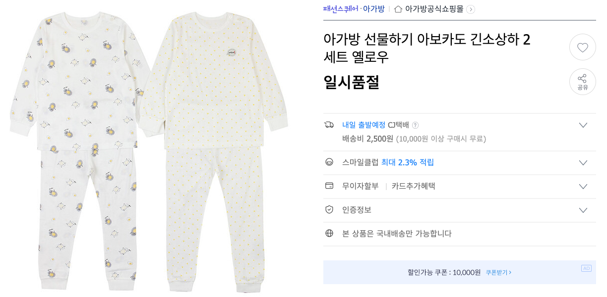 아가방 선물하기 아보카도 긴소상하 2세트 옐로우