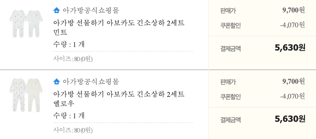 아가방 선물하기 아보카도 긴소상하 2세트 민트