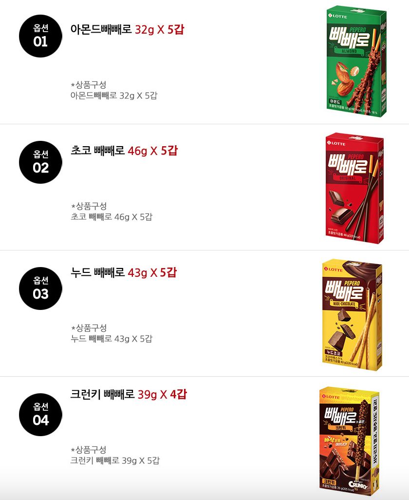 빼빼로(초코/아몬드/누드/크런키) 15곽 골라담기