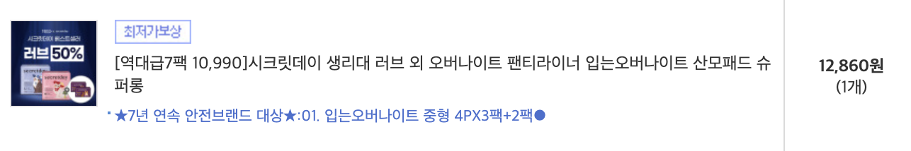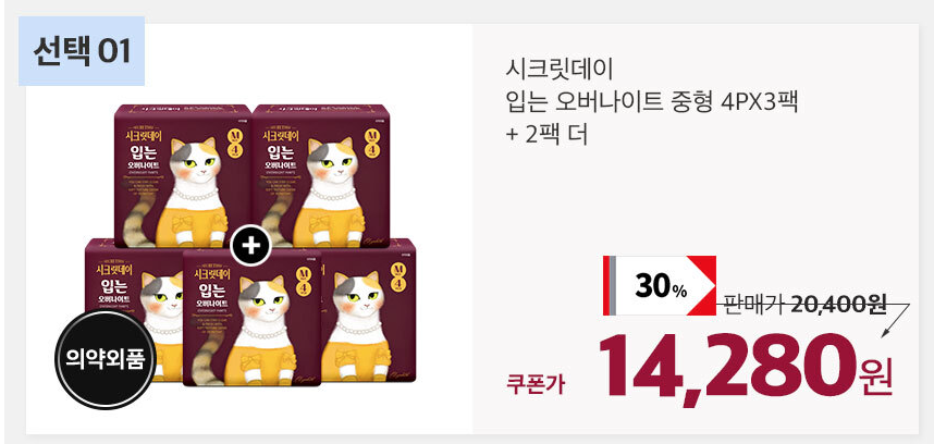 시크릿데이 생리대 러브 중형 16P * 7팩 판매처: 11번가 원가: 15,700 원 최종가: 9,900 원 (장당 88원) [11번가] [역대급7팩 10,990]시크릿데이 생리대 러브 외 오버나이트 팬티라이너 입는오버나이트 산