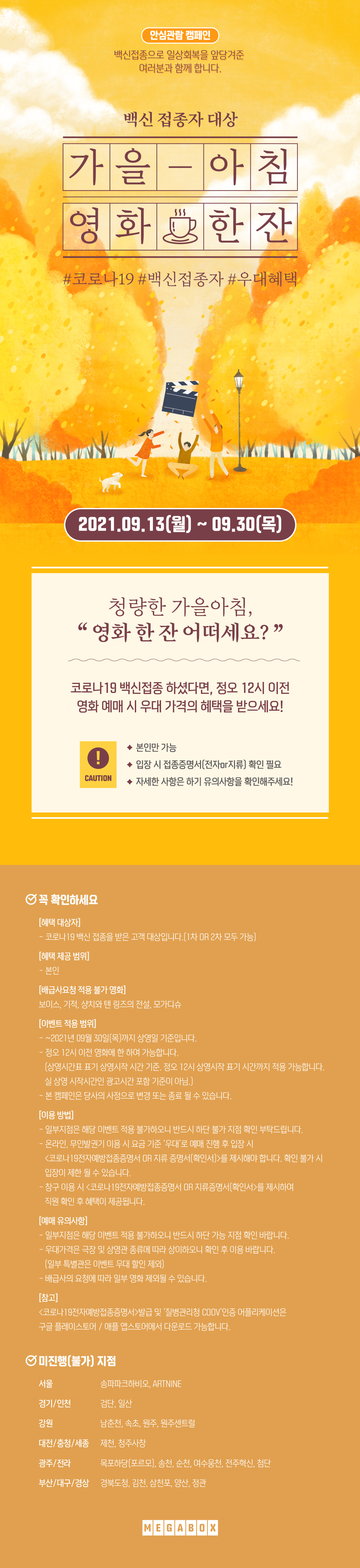 [메가박스]코로나19백신접종자대상 혜택 <가을아침, 영화 한 잔> 이벤트
