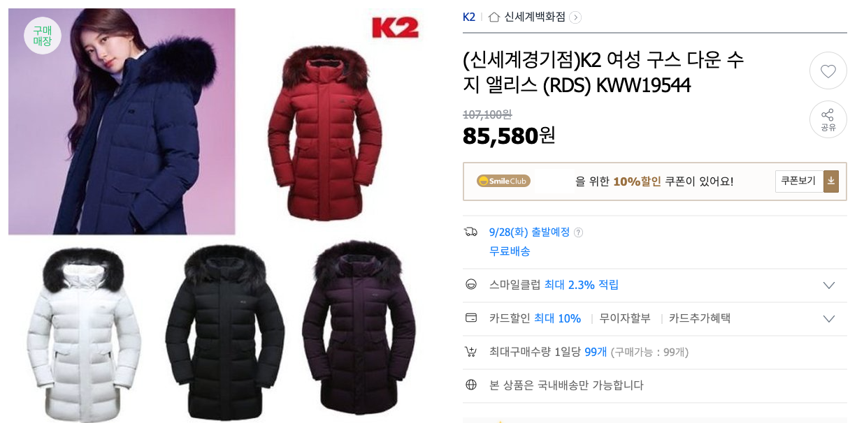 (신세계경기점)K2 여성 구스 다운 수지 앨리스 (RDS) KWW19544