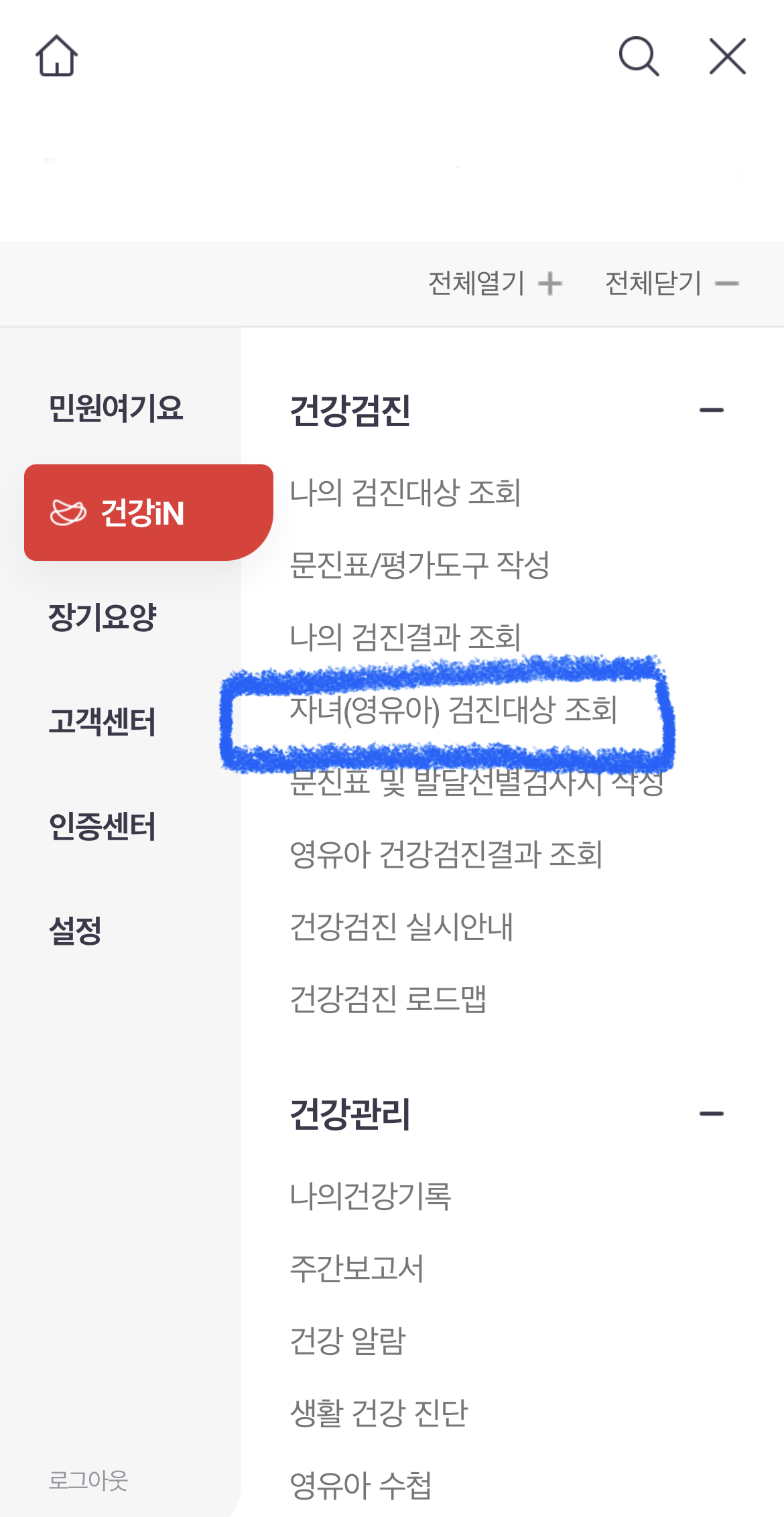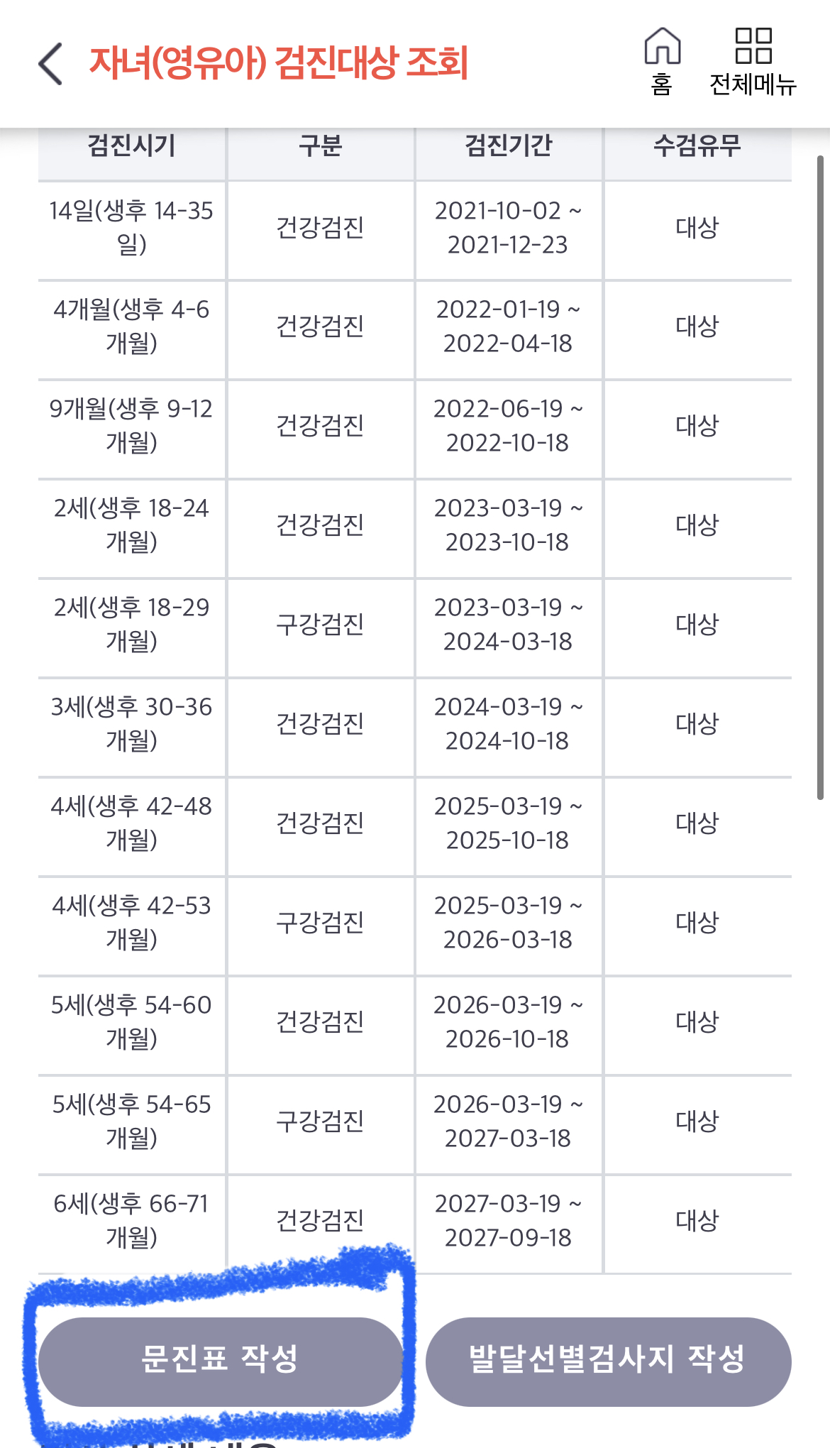건강In > 자녀(영유아) 검진대상 조회 > 문진표 작성