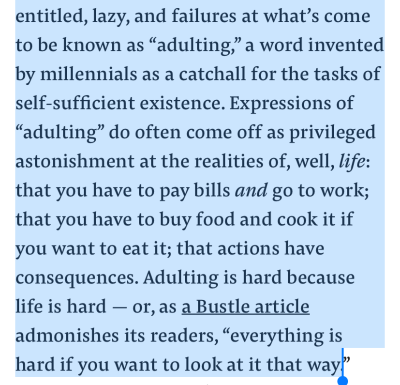... "adulting", a word invented by millennials as a catchall for the tasks of self-sufficient existence. Expressions of "adulting" do often come off as privileged astonishment at the realities of, well, life: that you have to pay bills and go to work; that you have to buy food and cook it if you want to eat it; that actions have consequences. Adulting is hard because life is hard - or, as a Bustle article admonishes its readers, "everything is hard if you want to looik at it that way."