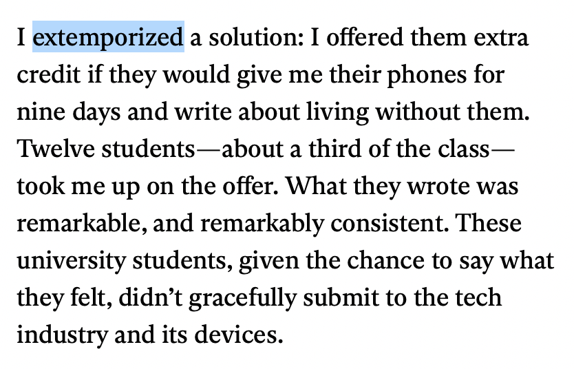 I extemporized a solution: I offered them extra credit if they would give me their phones for nine days and write about living without them.