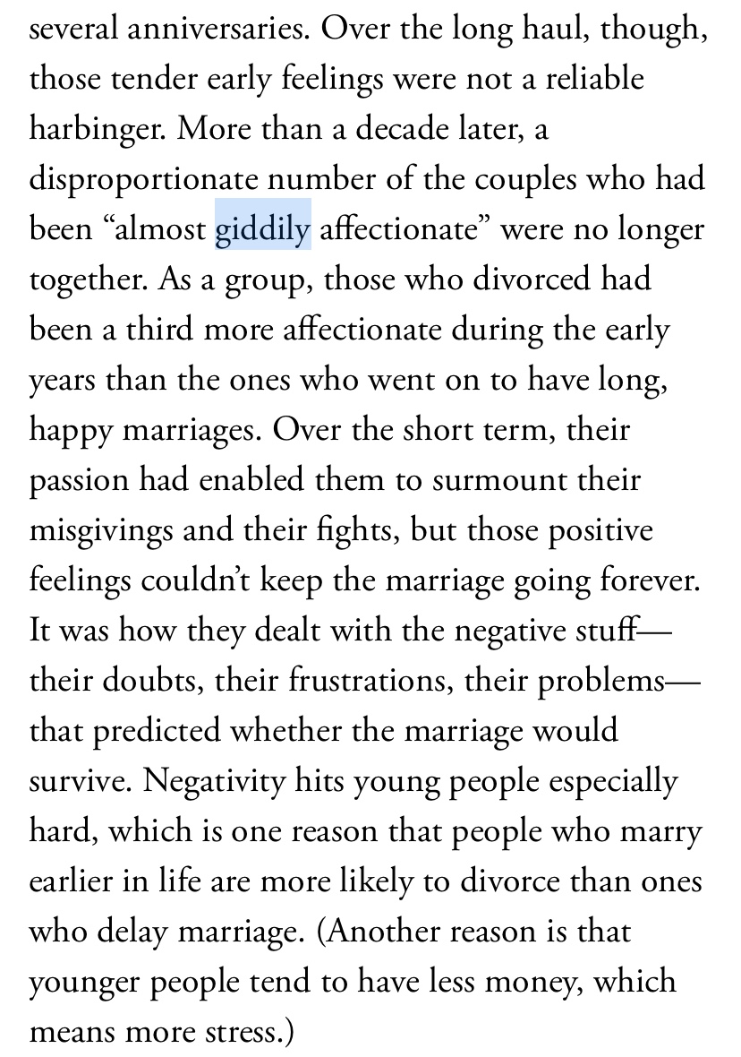 More than decade later, a disproportionate number of the couples who had been "almost giddily affectionate" were no longer togheter. As a group, those who divorced had been a third more affectionate during the early years than the ones who went on to have long, happy marriages.